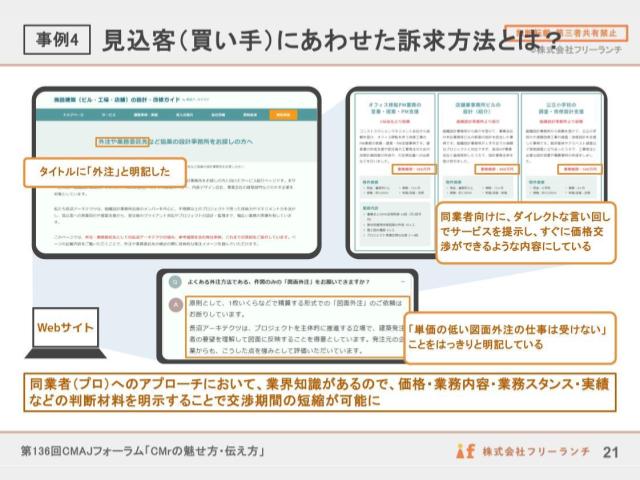 当日は、設計事務所や建設会社など、建設技術者が直面する「発注者へのアプローチ」や「建築の“売る技術”」を主軸に講演を行いました。